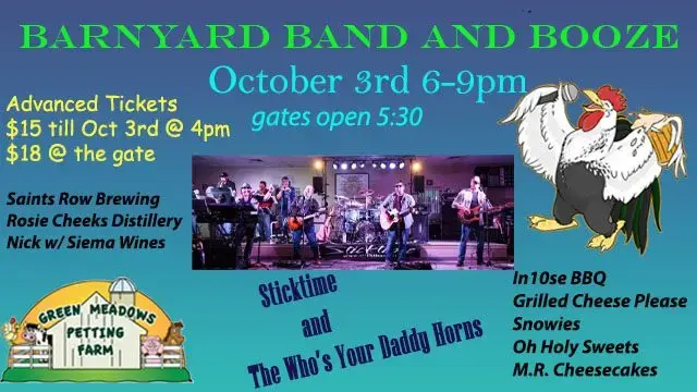 On Friday October 3 the farm is open for our LAST evening concert (rain or shine). Our featured band, Sticktime and The Who’s Your Daddy Horns, will begin playing at 6pm. We will also have various breweries,